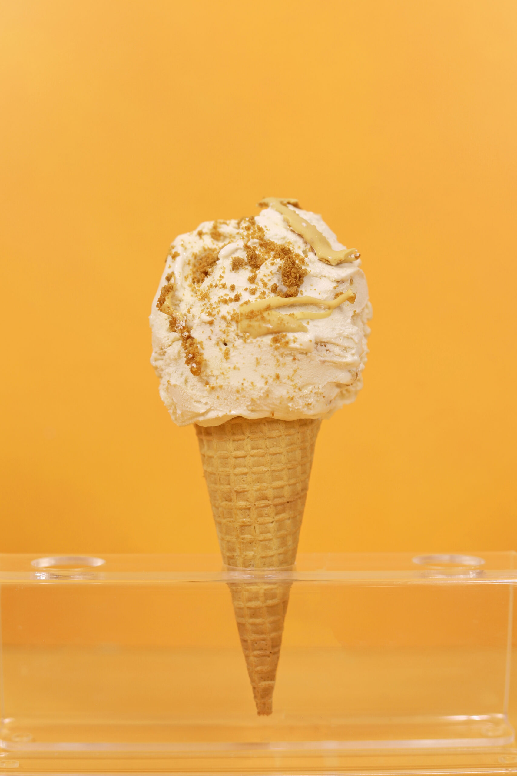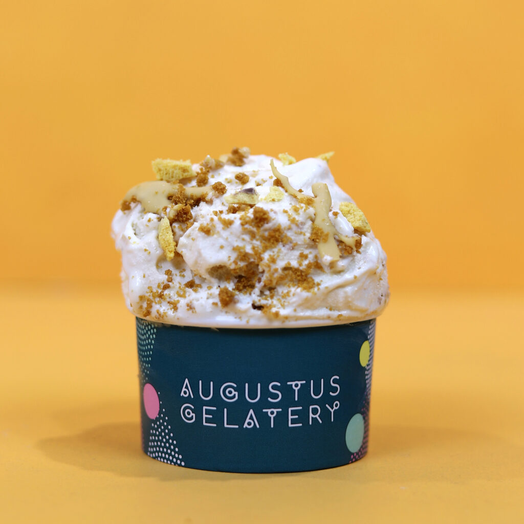 Creamy white chocolate gelato with crunchy honeycomb pieces and crumbled Biscoff biscuits