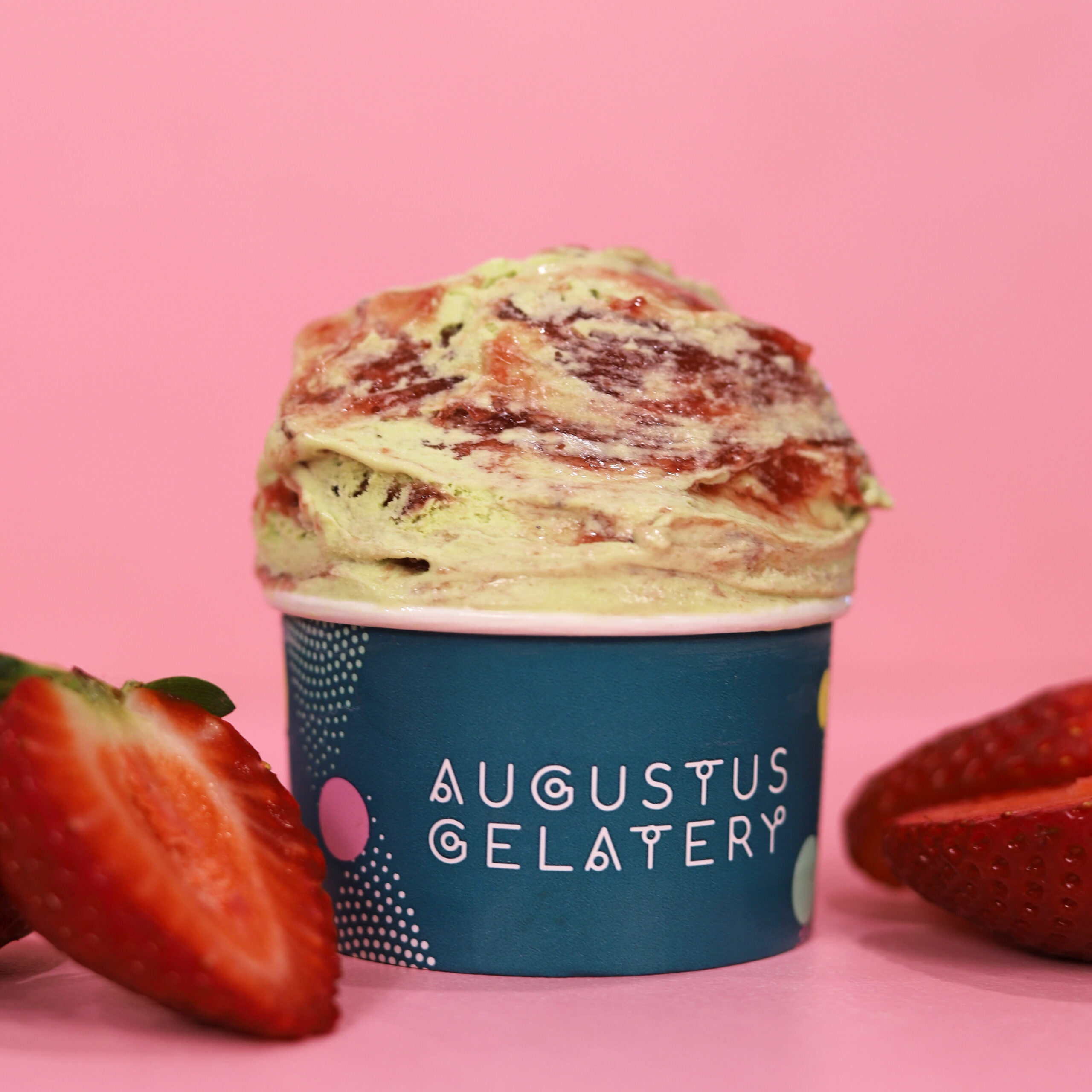 Premium matcha gelato, swirled with strawberry ripple.